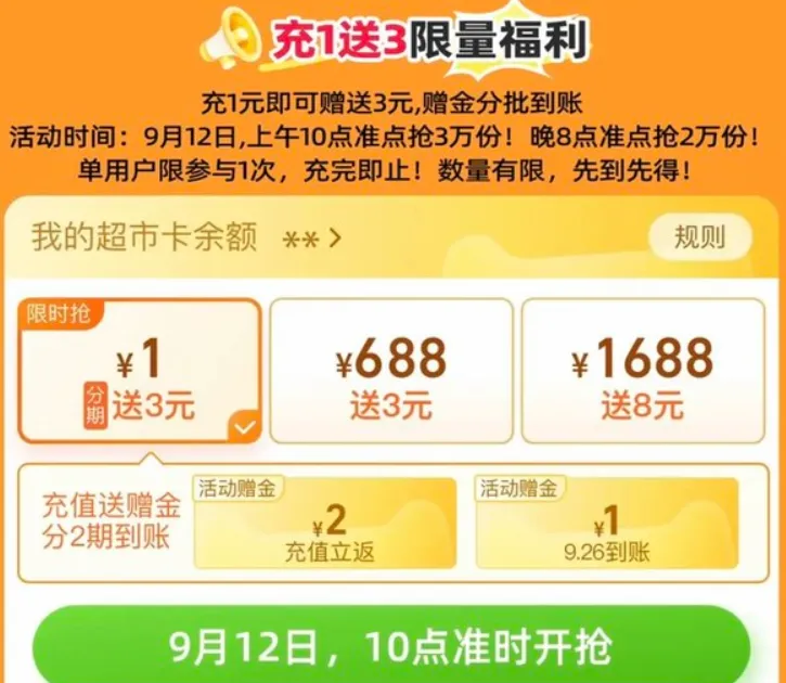 猫超卡充1送3活动(赠金分批到账),限量3万份