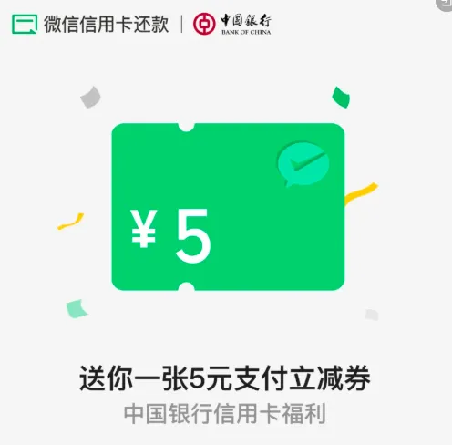 中行信用卡部分人有5元微信支付立减金。需要已绑定中行信用卡,