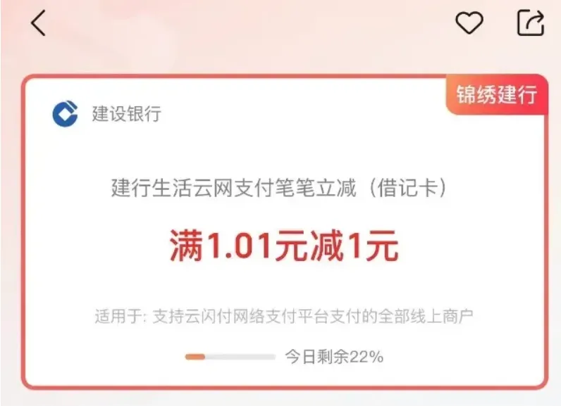 建行卡可立减1亓 储蓄卡和xyk各4次 试试看 部分地区满1.01就可以