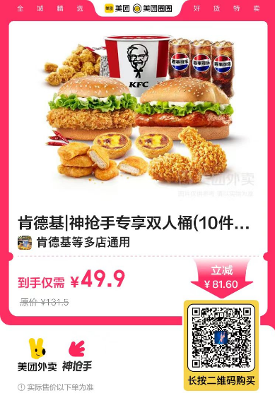 肯德基✦美团外卖 肯德基双人桶(10件套) 49.9 肯德基全鸡桶(12件套)69.9