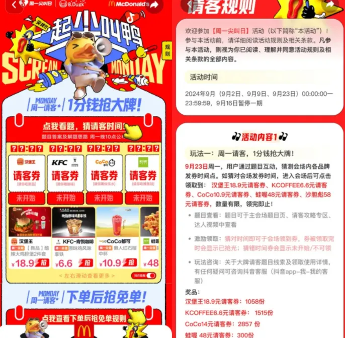 9月23日抖音APP搜索“周一尖叫日”->指定时间抢请客券,可0.01亓买美食。