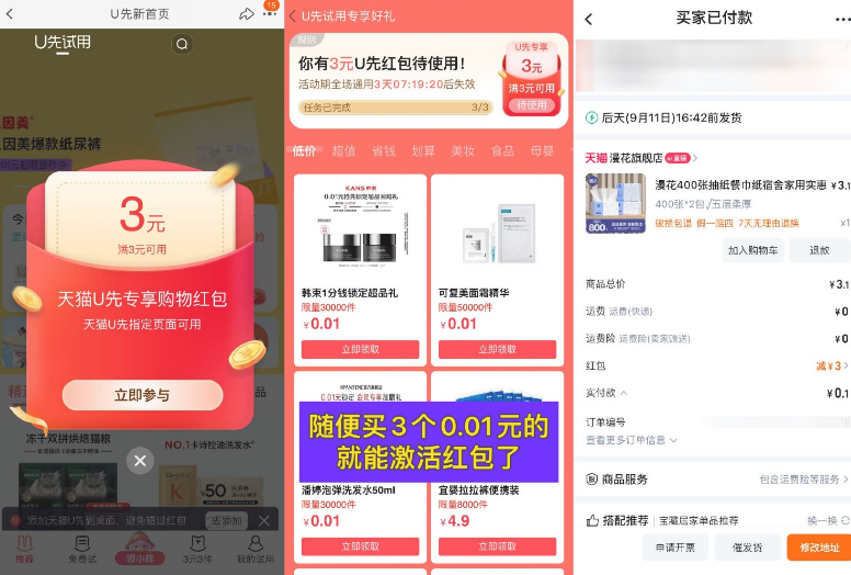 随便买3~8个0.01的就能激活,然后再买大于红包金额的东西即可抵扣