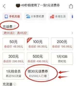 步骤三:充话费那一栏——最后面一个——领30元话费券~点进去~